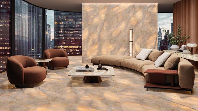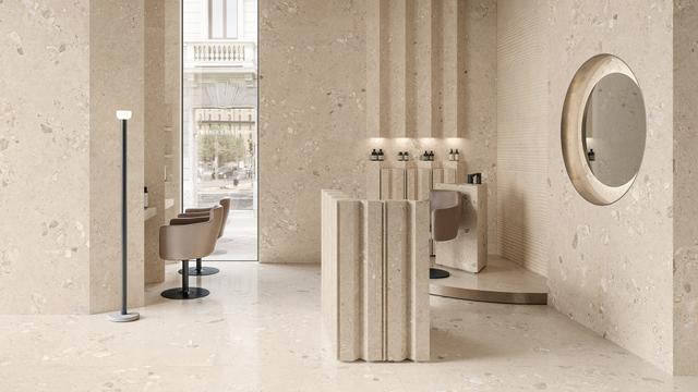 Die Fliesen aus Feinsteinzeug in der Farbe Natural sind schlicht und wirken mit ihrem Farbton sehr natürlich. Sie sind bewusst dezent gehalten und rücken die Einrichtung in den Vordergrund, die damit zum Blickfang im Raum wird. Also: Bühne frei für Tische, Sessel, Gemälde und Designobjekte.