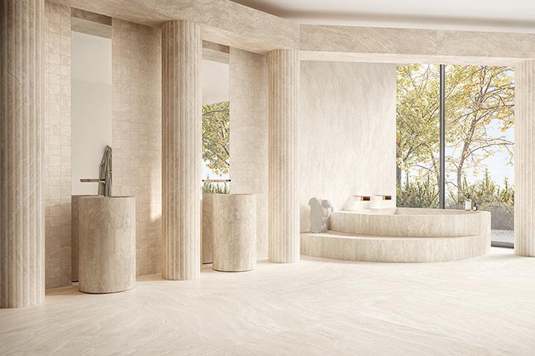 Emilceramica präsentiert die neue Kollektion Dual Travertine, inspiriert von gegen das Lager geschnittenem Travertin. Sie kommt in zwei Versionen daher: eine authentisch und naturnah mit dem ursprünglichen Erscheinungsbild des Gesteins und eine poliert und kompakt, geprägt von der Bearbeitung durch den Menschen. Zwei Versionen, vielfache Ausdrucksformen. Die Kollektion ist in zwei Finishvarianten erhältlich, und zwar in der offenporigen Variante Poro Aperto und in der geschlossenporigen Variante Poro Chiuso mit einer kompakten, eleganten Oberfläche, deren Poren Ton in Ton verspachtelt sind. Sie sind in zwei hellen, ausgewogenen Farbstellungen – White und Beige – verfügbar, die mit dem Materialbild in perfektem Einklang stehen.