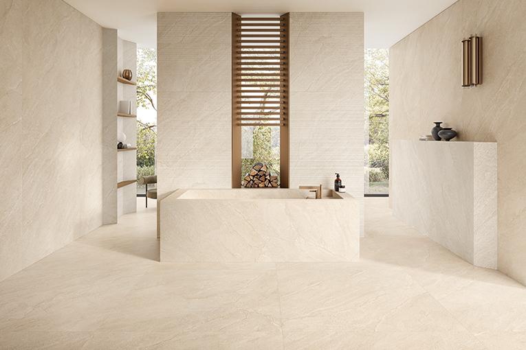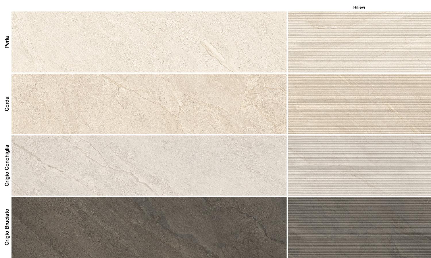 Die Kollektion Pietra di Orosei empfindet die für Sardinien typische sardische Brekzie nach und bringt dabei die Eleganz eines edlen Materials in eine neue, strukturiertere und modernere Form. Obwohl die Breccia Sarda als Marmor gilt, interpretiert das Keramikprojekt sie wie einen Stein und betont deren natürliche Nuancen, die Schichten und die mineralische Ästhetik. Das Ergebnis ist eine Kollektion von Keramikoberflächen mit sehr strukturiertem Charakter, welche die Faszination von Marmor mit der Erlesenheit von Stein verbinden. Die Textur ist reichhaltig, tief, nahezu pulsierend: Sie offenbart unregelmäßige Linien und zarte Kontraste, wobei die immer unterschiedlichen Äderungen wie natürliche, geschmeidige Fasern wirken. Pietra di Orosei eignet sich optimal für moderne Räume, wenn ein Gleichgewicht zwischen Raffinesse und authentischen Materialien gewünscht ist. Das Dekor Rilievi für Pietra di Orosei erzeugt eine tiefe und konkrete Dreidimensionalität. Die Bearbeitung erfolgt bis zu einer Tiefe von 5 mm und schafft damit ausdrucksstarke, markante Strukturen, die die Stofflichkeit der Oberfläche hervorheben. Mit diesem Dekor lassen sich skulpturale Wände schaffen, wo Licht und Schatten miteinander interagieren und den mineralischen Charakter der Kollektion unterstreichen.